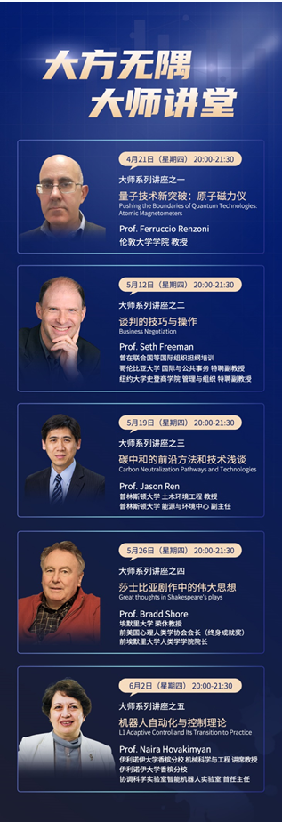 学生国际学术视野,增加与世界学术大师近距离接触的机会,满足学生学习多样性需求,提升多角度思考问题的能力,进一步加强学科交叉和跨学科人才培养,“让理工科的学生增加人文情怀,让人文社科的学生增强科学素养”,提高解决问题的学术能力,进行面向国际、面向未来、面向全人类的国际化思维训练。教务处在本学期将陆续推出《大方无隅·大师讲堂》系列大师讲座,来自全球一流高等学府和研究机构的专家教授将做客讲堂,与同学们分享科学人文前沿的研究方法、进展以及前沿交叉学科领域的新发展动向。