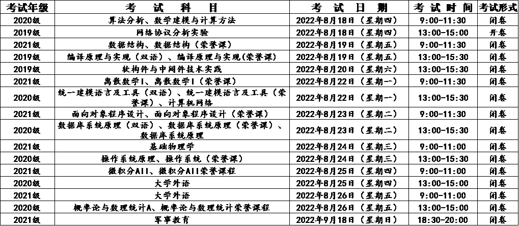 软件学院全体在校本科生(包含2019级,2020级,2021级)在2022年8月17日前必须返校,准备参加校内线下课程的考试及春季学期实验课补课。