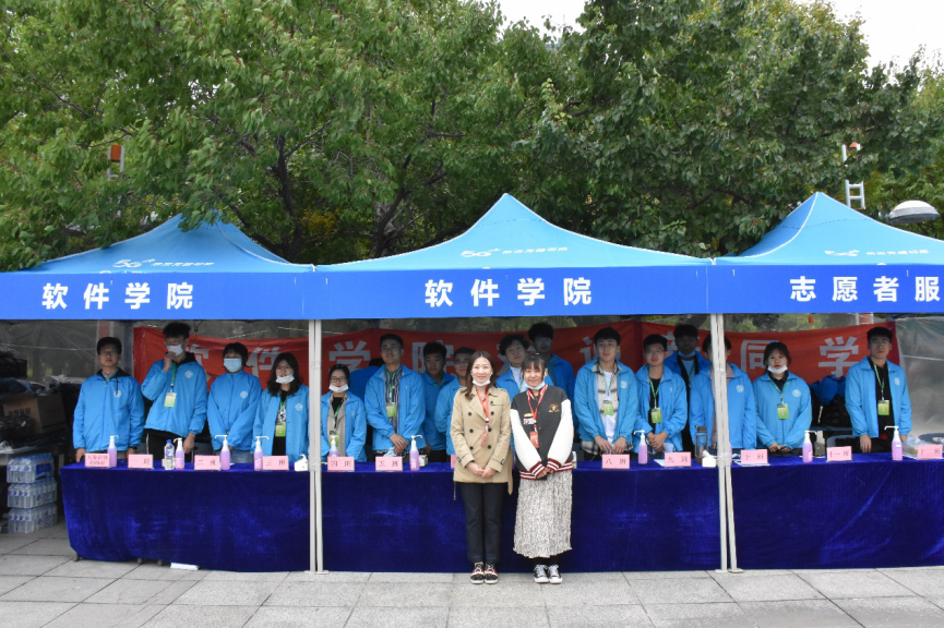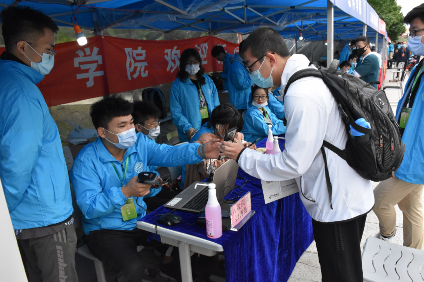 迎新帐篷下,志愿者们身着蓝色工作服,为新同学提供人脸录入、报到码扫录、报道资料袋发放等接待服务。针对一些家庭困难的新生,学院还开通了“绿色通道”,志愿者耐心地为他们讲解助学贷款申请办理等相关事宜。在这个疫情防控仍不能掉以轻心的特殊时期,学院还贴心地为新生们准备了防疫“健康包”。虽然这几日天气转凉,秋风习习,甚至一度下起大雨,但志愿者们的热情从未消减,始终尽心尽责地为新生们解疑答惑,让他们感受到软件大家庭的温暖。