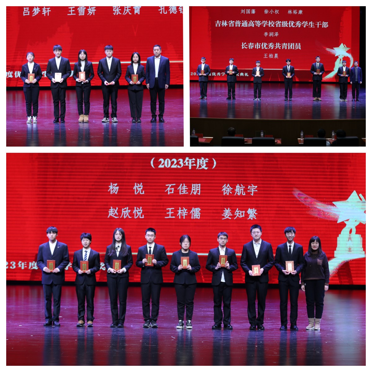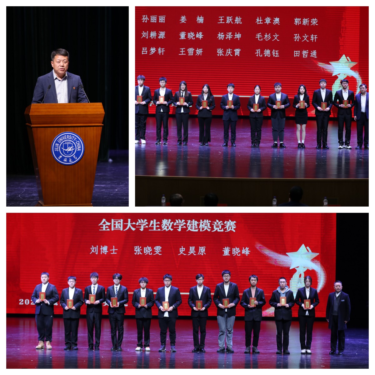 代磊老师、张剑宇老师分别为“吉林银行王湘浩奖励学金”获得者颁奖,表彰他们严谨求实、富于创新的治学精神,和不畏艰难、拼搏向上的意志品质。杨博教授为吉林省先进班集体、优秀研究生、优秀大学生、优秀学生干部、长春市优秀共青团员等荣誉称号获得者颁奖,希望受表彰的先进个人和集体珍惜荣誉,赓续奋斗,再创佳绩;希望广大青年学生向先进学习、向榜样学习,做社会主义核心价值观的坚定信仰者、积极传播者、模范践行者,在实现中华民族伟大复兴的时代洪流中踔厉奋发、勇毅前行。其他到场嘉宾分别为ACM国际大学生程序设计竞赛、“华为杯”中国研究生数学建模竞赛、CBC2022数据挑战赛、全国大学生数学建模竞赛、美国大学生数学建模竞赛等比赛获奖学生颁奖,对他们杰出的专业能力、精湛的实践能力、开拓进取的创新意识给予肯定,激励他们不断前行,勇攀高峰。本次颁奖典礼设置了解说环节,希望通过对奖项的介绍能够帮助新生厘清专业发展方向,指明未来努力道路,助力学生成长成才。