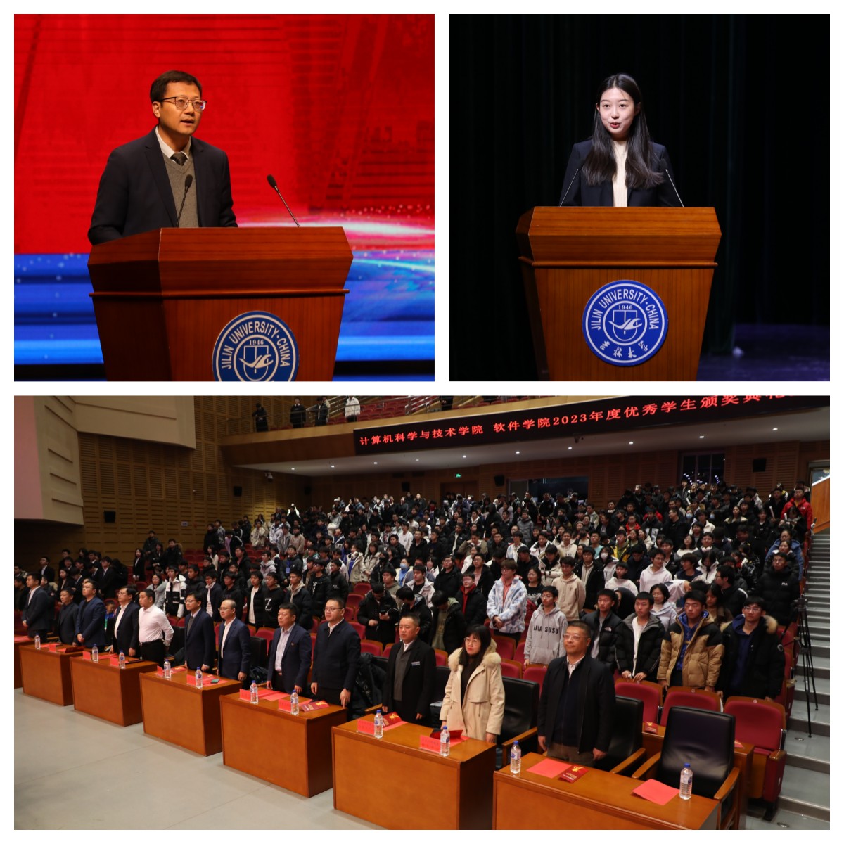 2023年12月16日晚18:30,计算机科学与技术学院、软件学院于鼎新大讲堂联合举办2023年度优秀学生颁奖典礼。校党委常委、副校长张国兴老师,学生工作部部长代磊老师,研究生工作部副部长兼管理办副主任张剑宇老师,保卫处处长刘雪峰老师,学生就业创业指导与服务中心副主任薛雷老师,学生心理健康指导中心主任朱丽雅老师,校团委副书记张大权老师,计算机科学与技术学院、软件学院院长杨博教授,计算机科学与技术学院党委书记宫皓宇老师,两院党政领导班子、教职工代表、2023级全体新生出席,计算机科学与技术学院党委副书记、软件学院副院长杜天宝主持了本次典礼。