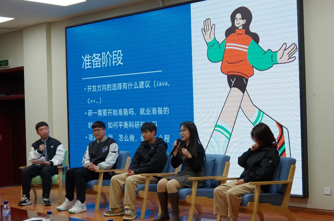 活动第一环节“干货论坛”由软件学院研会综合事务部尹馨慧同学主持,第一位分享嘉宾是现入职美团的杜铭同学,主要分享内容为准备互联网大厂的就业整体规划、专业技术学习等内容;入职华为单家旺同学就笔试算法与项目经历准备、综合面试技巧等内容进行了分享;盛建华同学主要分享内容为开发测试的就业经验、实习体验与未来发展等内容;最后一位带来分享的是入职蔚来的徐小惠同学,主要分享了算法岗岗位介绍、日常工作以及如何把握算法岗机会等内容。