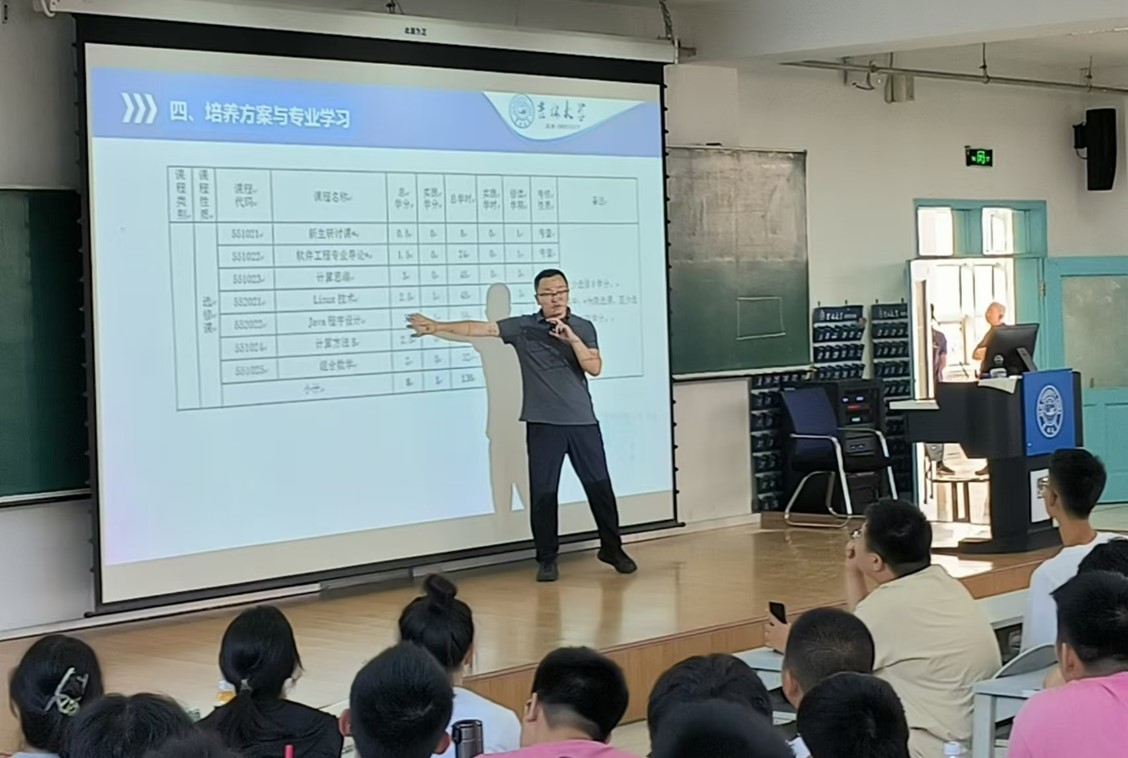 为帮助新生更好地理解专业教学大纲及课程体系,合理规划大学学习,软件学院于8月26日在第三教学楼第十二阶梯教室举办了新生入学教育系列活动——本科生课程培养方案解读讲座。此次讲座由软件学院副院长周柚和“卓越工程师班”学生思想政治导师柳军主讲,2024级全体本科新生参加。