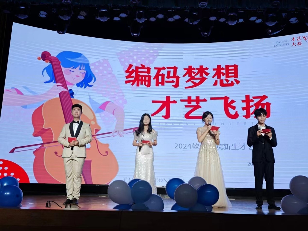 为展示新生风采、丰富校园文化生活,增进新生间的互动交流,软件学院于10月28日晚在敬信报告厅举办了“编码未来 才艺飞扬”新生才艺大赛决赛。本次比赛邀请了2024级新生辅导员王柏晨老师、2023校园歌手大赛冠军张以钧、季军单宝库、周奕彤以及部分学院团学学生干部担任评委,近300名新生与评委共同观看了本场盛大的才艺赛事。