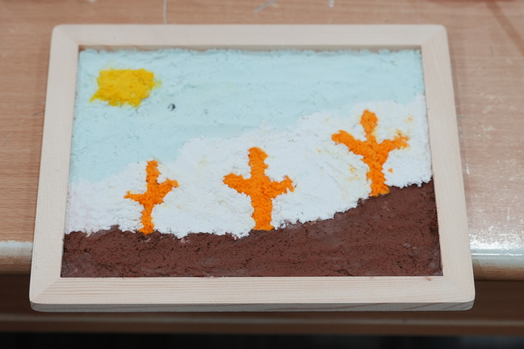 首先,文艺部成员通过PPT及实物进行示范讲解,详细介绍了粮食画的拼贴技法,通过将各种颜色的五谷粘在底板呈现不同的图案,表达的是对五谷丰登美好生活的希冀。纸浆画通过将废纸转化为纸浆,加入颜料和胶水在画板上塑形而成,成品具有粗糙质朴的质感与立体浮雕效果,常用于装饰或艺术表达,且其利用废旧纸张,有让旧物焕发新生的环保理念。