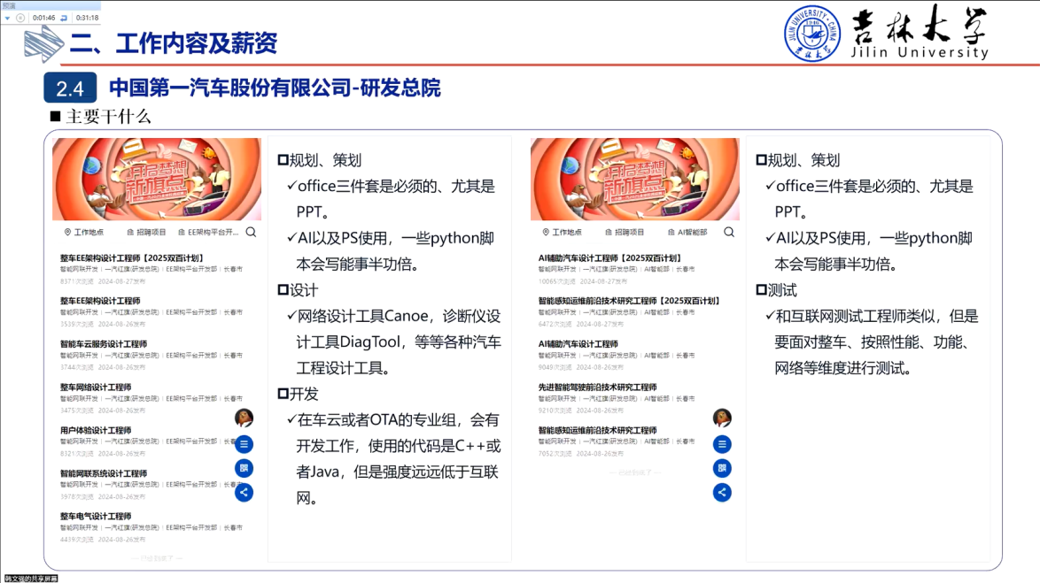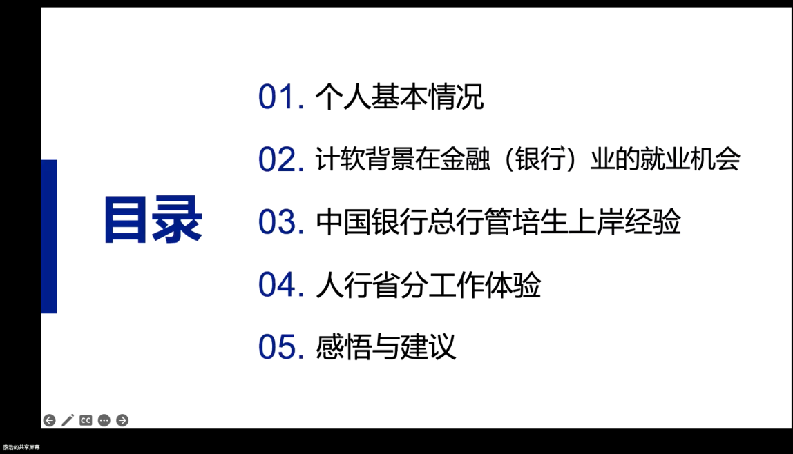 活动伊始,软件学院研究生会主持人逐一介绍四位分享嘉宾:互联网领域优秀校友代表吕浩、渤海银行及一汽集团职业发展校友代表韩文强、中国银行与人民银行从业者薛浩,以及就职于烟草系统的盛建华。韩文强同学以“国企职业选择与价值实现”为主题,结合自身在一汽集团的工作经历,剖析了国企的工作环境、薪资待遇与职业发展路径,并分享了如何在薪资稳定性与个人成长空间之间权衡的思考。薛浩同学聚焦金融行业,从银行笔试高频考点到国企人际关系处理技巧,层层拆解非技术岗位的求职策略。吕浩同学系统梳理了互联网行业的技术能力要求与面试核心逻辑。他通过对比不同规模企业的招聘偏好,指出“技术深度与业务理解力并重”是突破大厂门槛的关键。盛建华同学以烟草系统为例,详细分析了垄断行业的招聘特点与职业稳定性优势,为追求“work-life balance”的同学提供了新思路。