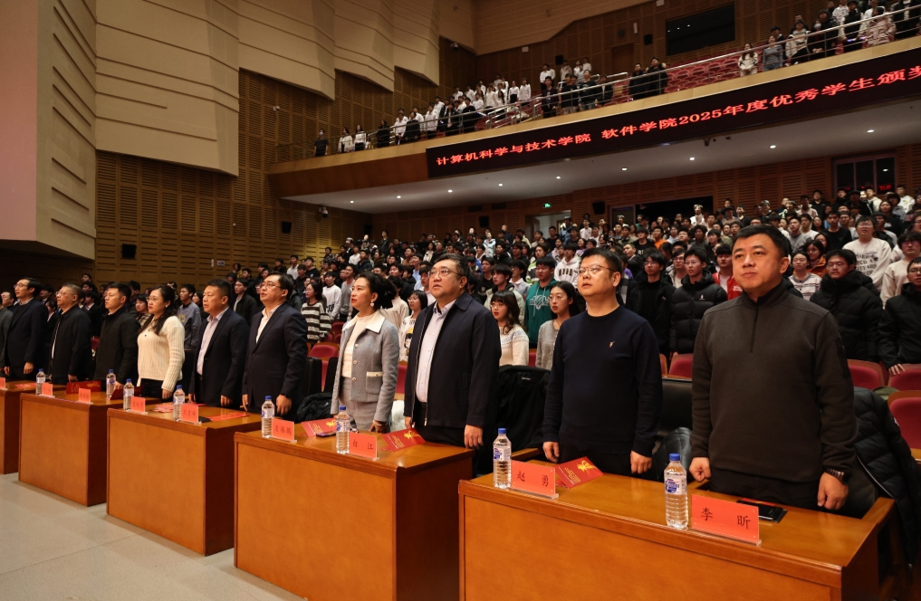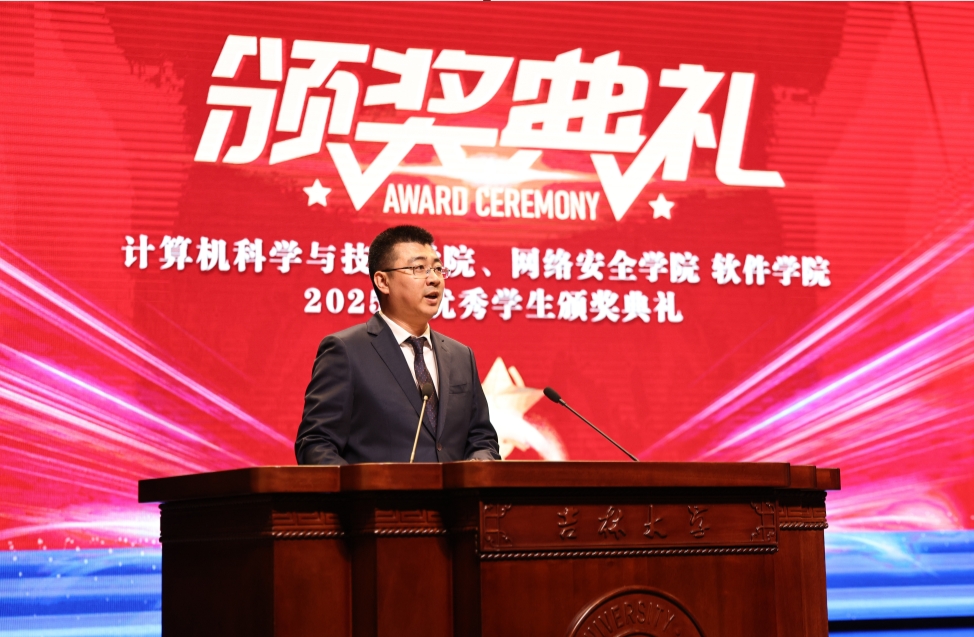 2025年12月5日晚六点,计算机科学与技术学院、网络安全学院、软件学院2025年度优秀学生颁奖典礼于鼎新大讲堂隆重举行。保卫处处长刘雪峰老师、学生心理健康指导中心主任朱丽雅老师、学生工作部副部长左振鹏老师、研究生工作部副部长马琨老师、学生就业创业指导与服务中心副主任白江老师、大数据和网络管理中心副主任张达鑫老师、计算机科学与技术学院党委书记宫皓宇老师,学院及中心党政领导班子、教职工代表以及2025级新生出席,计算机科学与技术学院党委副书记兼软件学院副院长冯羿铭老师主持本次典礼。