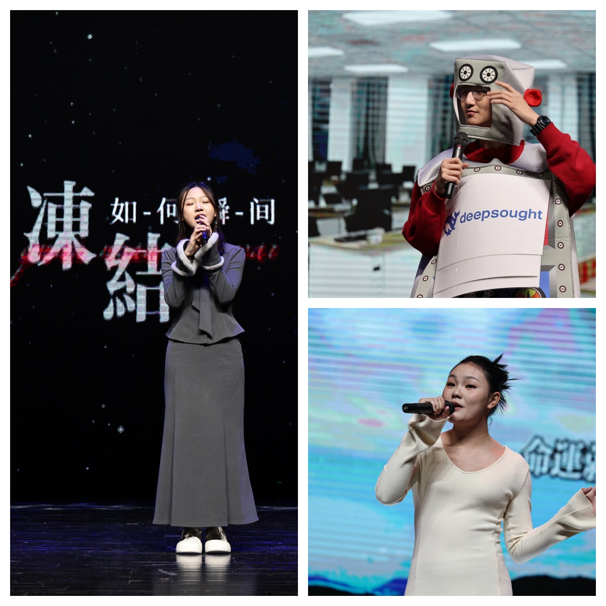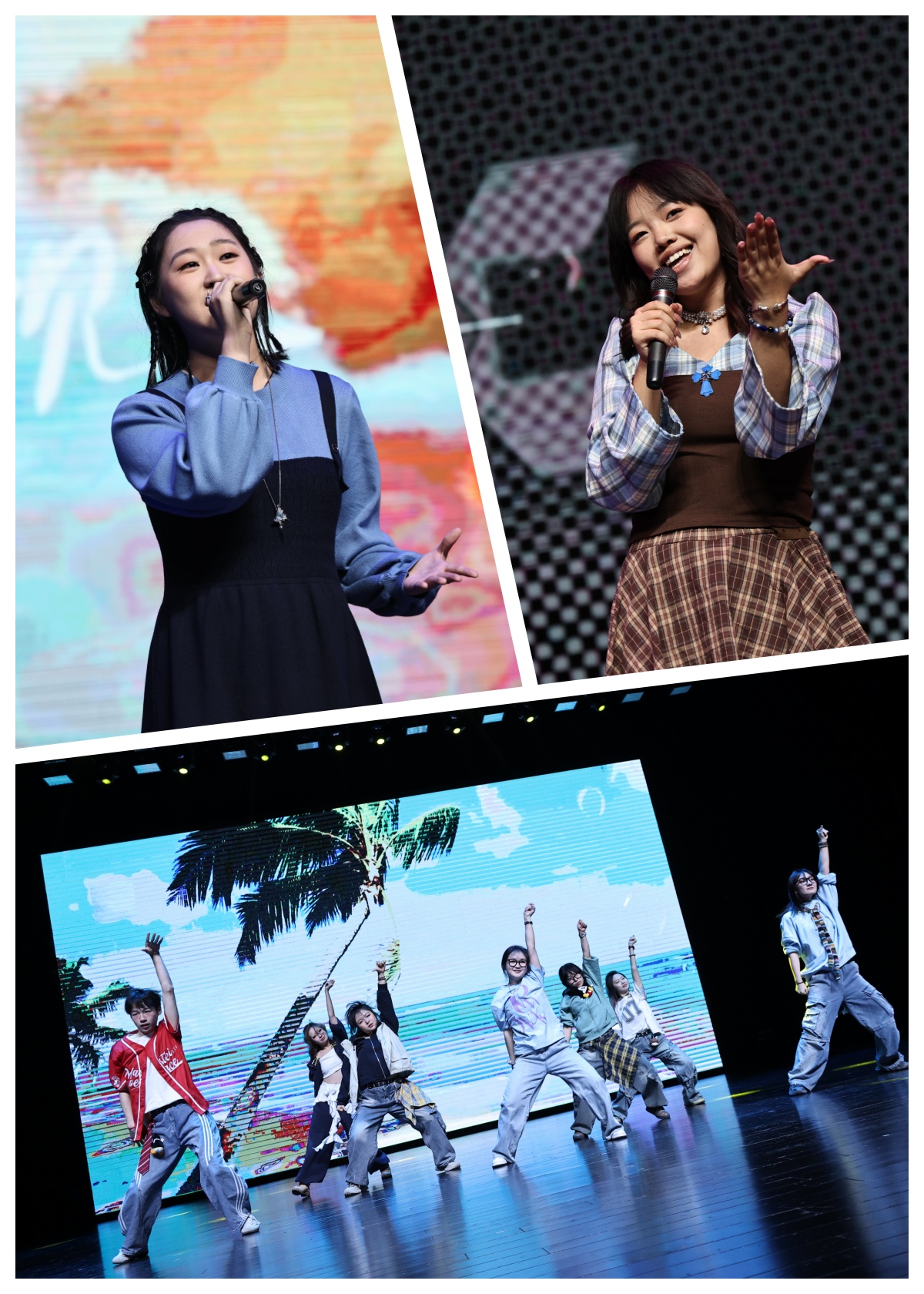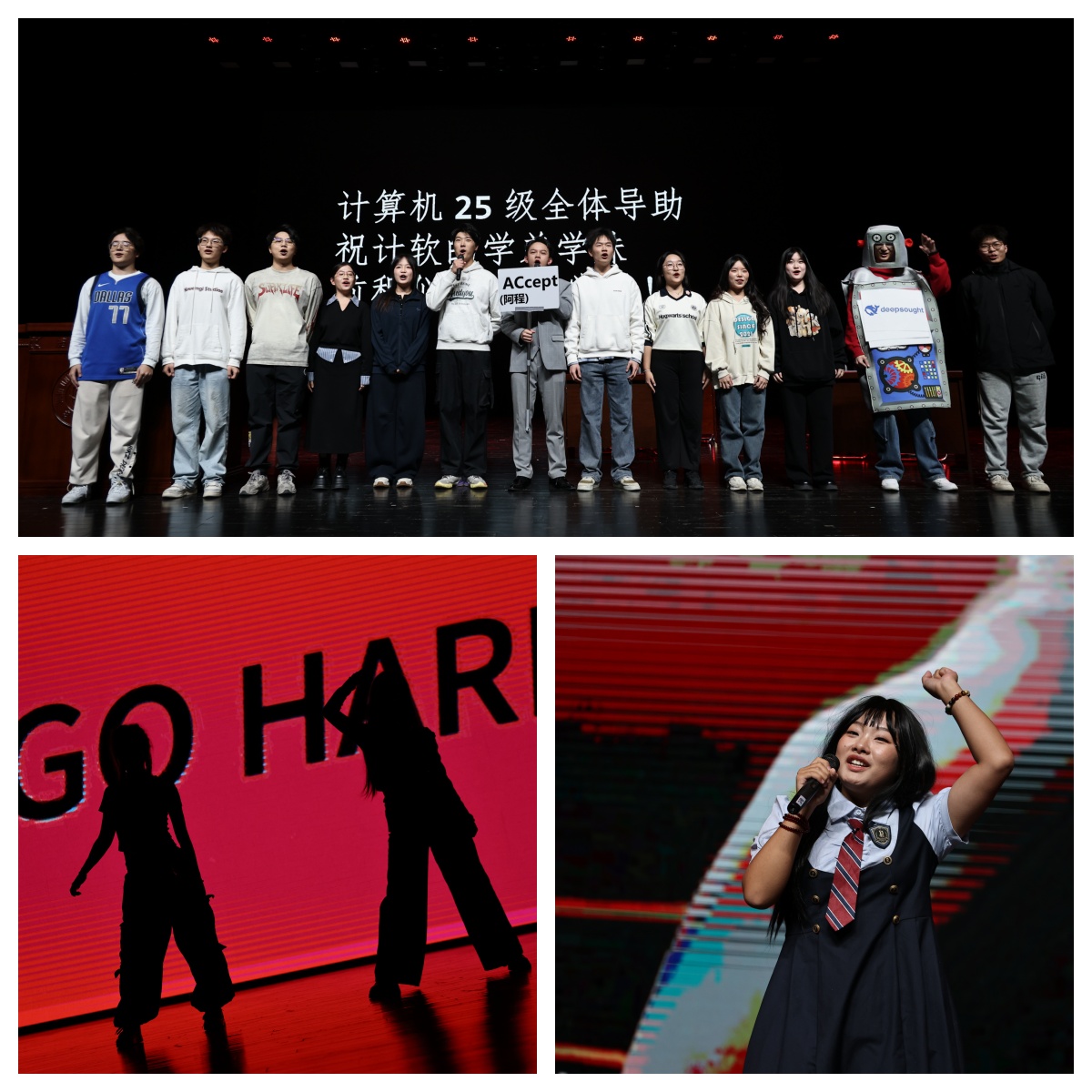 晚会以JustYe街舞社带来的活力开场舞《Body》拉开序幕,动感的节奏与跃动的舞姿迅速点燃全场热情。随后,钟泽媛、赵书玉带来的歌曲串烧《再见深海》《小酒窝》,温润声线勾勒出深情画面,传递出大学初遇的温暖与感动。李泓锦的街舞表演《Intro》以精湛舞技展现青年风采,赢得阵阵喝彩。周慧、姚雨涵的《红日》《Try Everything》两首励志歌曲,唱出奋发向上、敢于尝试的青春态度,引发观众共鸣。吉他弹唱《手写的从前》以清新旋律唤醒校园记忆,勾勒出青葱岁月里的纯粹美好。由软件学院45名研究生同学共同演绎的朗诵《青年说》,气势磅礴,字句铿锵,彰显新时代青年的责任与担当。王佳玉的一首《光年之外》空灵悠远,带领观众遨游于音乐与遐想的星空。街舞串烧《Whiplash》《Illusion》《Go Hard》将舞台化为能量迸发的竞技场,高难度动作与默契配合将晚会推向高潮。四重唱《鹿Be Free》纯净治愈,仿佛林间清风,抚慰心灵。辅导员助理演绎的原创情景剧《重生之我是AC高手?》,以幽默诙谐的方式呈现学子在代码与学业中穿梭的奇想故事,笑声中蕴含对专业学习的思考。付芮荧的《我会等》,歌声真挚动人,勾勒出青春里关于坚持与等待的情感画卷。最后计算机学院110名研究生共同唱响《我和我的祖国》,深情激昂的歌声融合了青春的热血与对祖国的热爱,为整场晚会画上温暖而有力的句号。