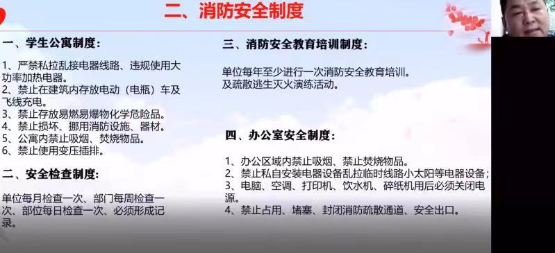 为进一步落实学校通知要求,保证学生公寓用火用电安全,提升师生消防安全意识及自救能力,计算机科学与技术学院、软件学院、公共计算机教学与研究中心于2022年4月12日晚7:30联合举办了安全知识培训,培训由计算机科学与技术学院副院长李昕主持,近千名师生参加此次线上培训。