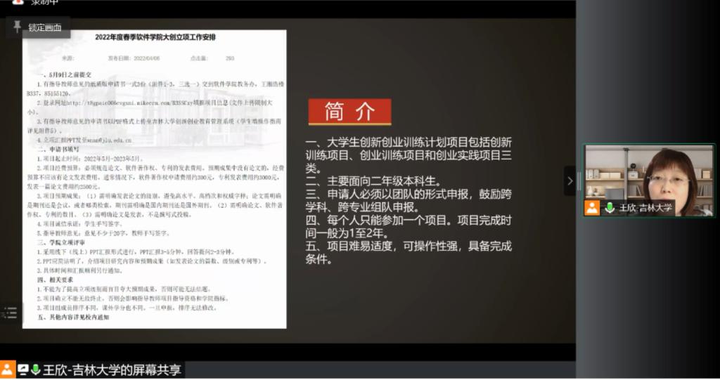 4月13日晚上19:00-20:30软件学院大创项目系列讲座通过腾讯会议直播正式开始。第一场讲座是由计算机科学与技术学院副教授王欣带来的项目交流会。王欣老师从获得课外培养计划学分的主要方法,到参加保研综合面试的切身感受,再到指导大创项目的亲身经历,与同学们深入探讨了大学生做大创项目的意义。做大创项目好比用电钻在平滑的墙面上钻钉子,如果你找到合适的切入点,就可能对你的未来有一个重要的影响。接着,王欣老师与大家分享了组建大创团队以及申请书撰写的注意事项,并用自己申报学校项目举例告诉大家撰写大创项目的申请书很重要,规范申请书格式也同样重要。讲座过程中,有同学就学习吃力是否适合做大创等问题与王欣老师进行了在线沟通。讲座最后,王欣老师希望通过本次讲座,助力同学们的创新创业小舟扬帆起航。