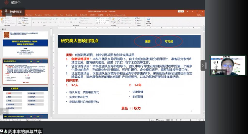 4月17日晚上19:00-20:30软件学院大创项目系列讲座第四场如约而至。计算机科学与技术学院教授、博士生导师周丰丰为同学们带来了以“研究类大创项目全流程规划”为主题的腾讯会议直播讲座。首先,周丰丰老师为大家简要介绍了研究类大创项目的整体规划和时间节点。接下来,周丰丰老师以科研项目选题的可行性为切入点,结合实验室发表文章的实例为同学们详细讲解了论文选题、调研、复现、改进结果、优化算法、论文方案、论文写作、投稿审稿等环节的注意事项。周丰丰老师建议大家在研究工作中培养严谨的工作态度和良好的工作习惯,如遇退稿要认真回复编辑和审稿人的所有意见,如暂离工作要做好文档、论文或实验数据的保存备份,切莫因小失大。最后,周丰丰老师表示良好的开端是成功的一半,希望大家多做研究、多发论文。