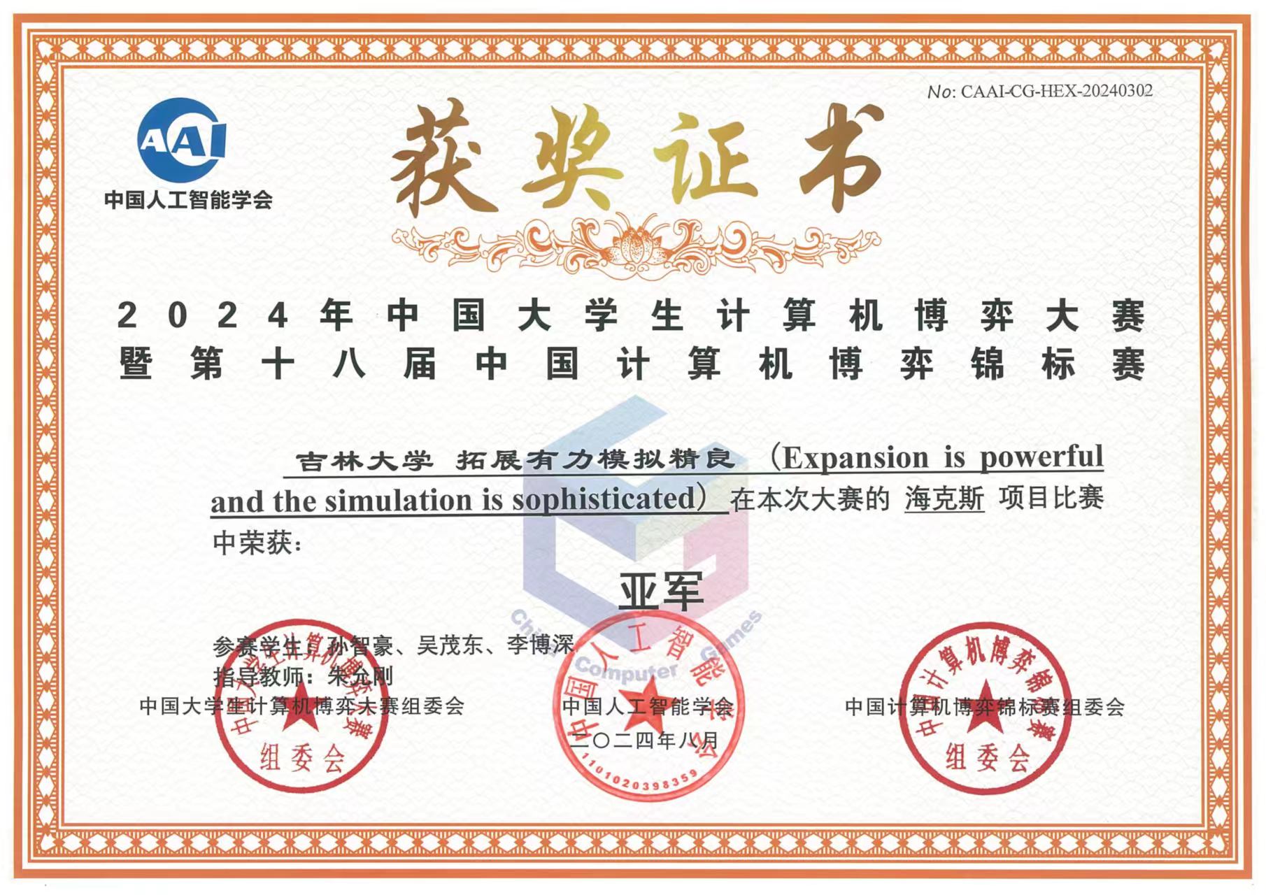 队伍发挥出色,最终获得全国一等奖8项、二等奖1项的好成绩。其中由朱家顺、李衡、张佳琦和康兆璐组成的吉软亚马逊(JLUAmazon)队在亚马逊棋项目中获得全国冠军,由孙智豪、吴茂东、李博深组成的拓展有力模拟精良(Expansion is powerful and the simulation is sophisticated)队在海克斯项目获得全国亚军。充分体现了学院在计算机科学教育方面的深厚积淀。