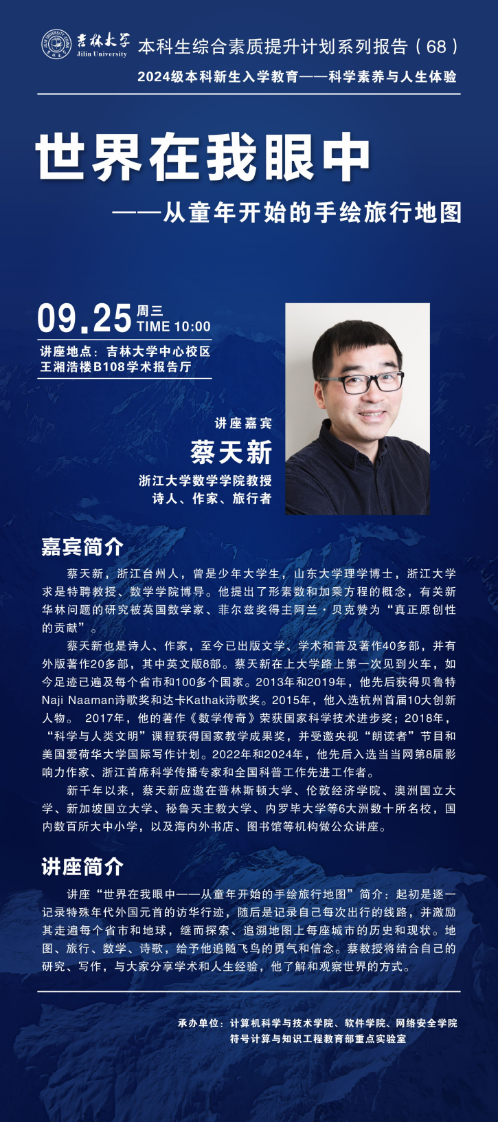 报告人简介:蔡天新,浙江台州人,曾是少年大学生,山东大学理学博士,浙江大学求是特聘教授、数学学院博导。他提出了形素数和加乘方程的概念,有关新华林问题的研究被英国数学家、菲尔兹奖得主阿兰·贝克赞为“真正原创性的贡献”。