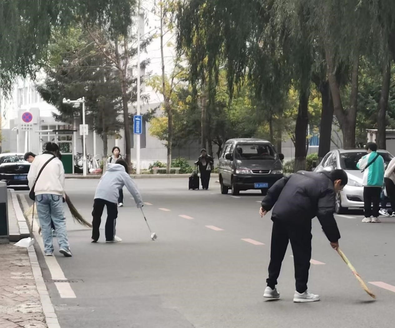10月1日早晨8点,伴随着清晨的第一缕阳光,活动正式拉开帷幕。软件学院60名同学齐聚宋志平体育馆门前,手持扫帚、簸箕等清洁工具,整装待发。活动分为两队,每队30人,路线围绕校园一周,从宋志平体育馆出发,沿主干道进行落叶清扫,最终在东门汇合。