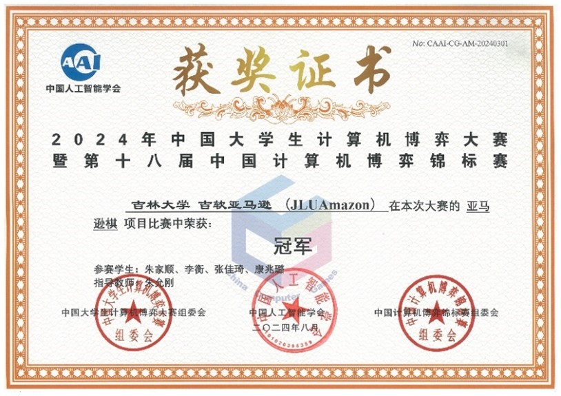 队伍发挥出色,最终获得全国一等奖8项、二等奖1项的好成绩。其中由朱家顺、李衡、张佳琦和康兆璐组成的吉软亚马逊(JLUAmazon)队在亚马逊棋项目中获得全国冠军,由孙智豪、吴茂东、李博深组成的拓展有力模拟精良(Expansion is powerful and the simulation is sophisticated)队在海克斯项目获得全国亚军。充分体现了学院在计算机科学教育方面的深厚积淀。